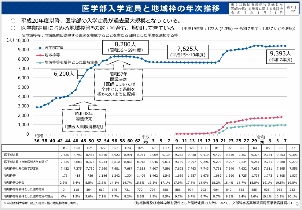 そうした声を受けて国は、医師養成数増加に舵を切り、新たに臨時定員増(地域枠・地元出身者枠)を設け、現在は2つの医学部新設を加えて年間約9,400名前後の医師養成数となっている。