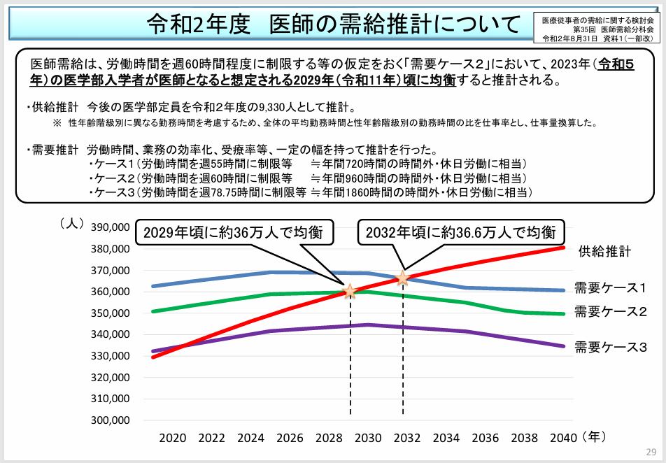その結果、中位[需要ケース2]では2029年頃に医師数約36万人、上位[需要ケース1]推計でも2032年頃に医師数36.6万人で需給が拮抗するとしている。